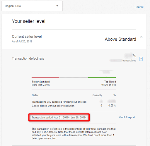 全てのアカウントにおいてTracking uploaded on time and validated(追跡番号有効率)の項目は過去3ヶ月、Transactions and sales(取引数と売上高)の項目は過去12ヶ月が評価対象期間となります。